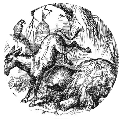 Of course, the most common mascot symbol for the Democratic Party has been the donkey. The story goes that Andrew Jackson’s enemies made fun of his name to “jackass” as a term of ridicule, but the Democrats liked it! It was on this day in the pages of Harper’s Weekly where the Democratic Jackass was first presented. Cartoonist Thomas Nast featured the donkey in his drawing called “A Live Jackass Kicking a Dead Lion.” (Wikimedia)