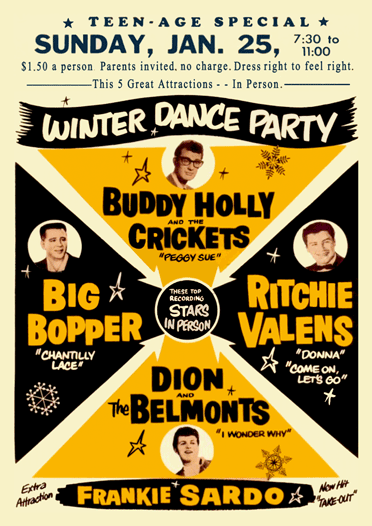 Buddy Holly’s Winter Dance Party tour began in Milwaukee, Wisconsin on January 23, 1959. With him was Waylon Jennings (electric bass), Tommy Allsup (guitar), and Carl Bunch (drums). Traveling for the band was a nightmare on an unheated bus with long distances between venues. The bus broke down twice and Bunch had to be hospitalized for frostbite. Holly charted a small plane to fly from Clear Lake, Iowa to Moorhead, Minnesota for himself, Jennings and Allsup.