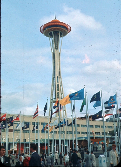 In 1959, Edward E. Carlson, president of Western International Hotels, scribbled his idea for the main structure to serve as a centerpiece to the 1962 World’s Fair on a paper napkin at a local coffee house. Inspired by the Stuttgart Tower in Germany, Carlson thought a similar building would fit the “21 Century” theme of the Seattle fair. The design of the building went through many shapes before settling on the “flying saucer” idea which wasn’t finalized until a year and a half before the fair’s opening.