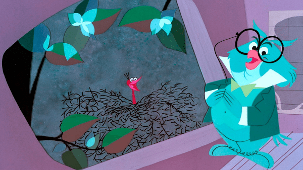 The film begins with Professor Owl teaching his students about music. (In more recent years, this scene has been used for the opening of many of the Disney’s Sing-a-Long videos) The study of musical instruments included four core sounds: Toot (brass), Whistle (woodwind), Plunk (strings) and boom (percussion) with each presented as caveman character. The short won the 1954 Oscar for Best Short Subject.