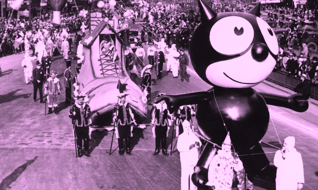 From the very first outing, the parade included elaborate costumes, floats, professional bands and even live animals that were borrowed from the Central Park Zoo. At the end of the parade when Santa made his entrance, he was escorted to the balcony of the 34th Street store entrance where he was crowned the “King of the Kiddies.” Three years later the parade saw its first large balloon character – Felix the Cat. (Wikimedia)