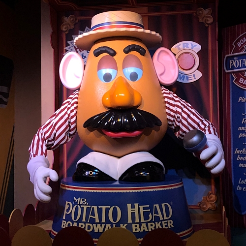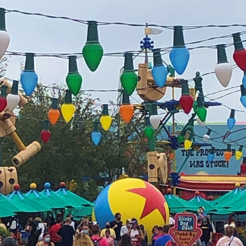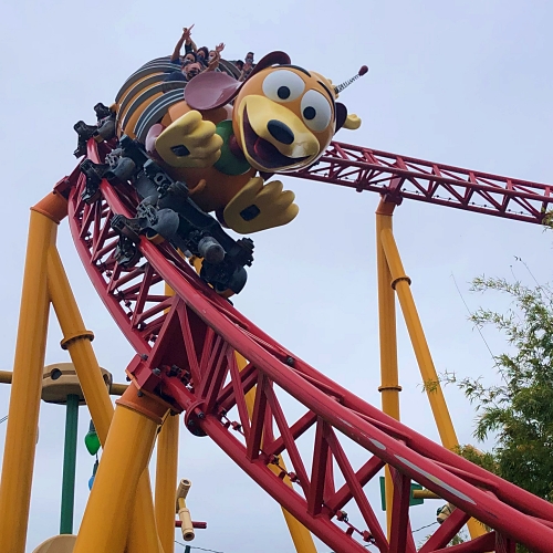 I’ve to got to say that “Toy Story Land” is one of the weakest names for a Disney “land.” It features three attractions: Toy Story Mania, Slinky Dog Dash and Alien Swirling Saucers. We’ve experienced Toy Story Mania at Disney’s California Adventure (known there as Toy Story Midway Mania) and loved it, but here, the ride’s setting is a little different. You’re welcomed to the back yard and you are the size of a game piece. The place looks like a young boy (Andy) has spread out all of his toys and games on the backyard lawn and just left it a mess. Inside a game box, guests board vehicles armed with equipment meant to shoot a variety of targets with different games. Similar and yet very different from the Buzz Lightyear ride at Magic Kingdom.