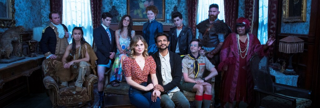 Adapted from a British comedy of the same name, Ghosts debuted last night on CBS with two back-to-back episodes. The story features two mortals, pessimistic Jay (Utkarsh Ambudkar) and optimistic Samantha (Rose McIver), who learn that they have just inherited Woodstone Manor, Samantha’s great aunt’s mansion located out in the middle of nowhere. Jay is skeptical, but his wife is already picturing paint colors in her head. They talk about turning the place into a bed-and-breakfast. Sam reasons that Jay is a chef so that already takes care of the “breakfast” part and she is a writer who can work anywhere, so they decide to make a go of it.