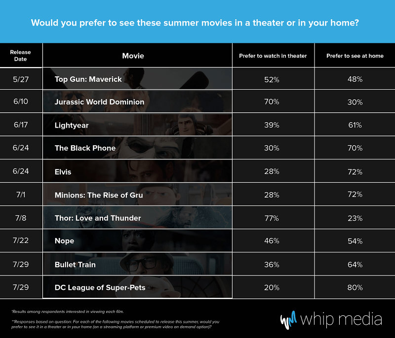 The survey found that franchise films and sequels continue to attract theater goers while viewers still prefer to watch family and smaller films at home. For instance, when it comes to the upcoming Thor: Love and Thunder, 77% of surveyors said they would prefer to watch Thor in the theater versus 23% who plan to watch it at home. Thor is followed by Jurassic World Dominion (70%), Top Gun: Maverick (52%), and Jordan Peele’s Nope (46%) as the movies viewers most want to see in theaters. The movies that respondents prefer to watch at home include family-oriented titles such as DC’s League of Super-Pets (80%), Minions: The Rise of Gru (72%), and Lightyear (61%) topping the list. They also prefer to see the biopic Elvis (72%) and the horror film The Black Phone (70%) at home.