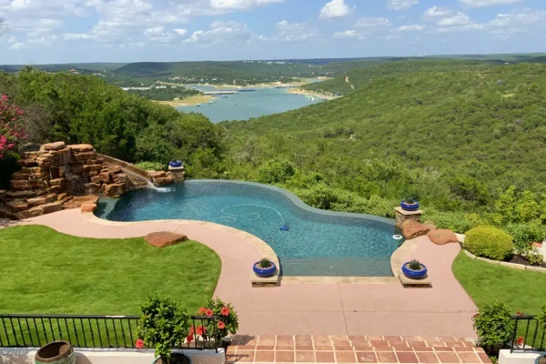They say that everything is bigger in Texas and this spot fills the bill boasting of being one of the best locations to feature views of Lake Travis. The infinity pool is 8′ deep with a waterfall grotto and waterslide. The patio area is enormous with high end furniture, private bathroom, grill, fridge, fans, WiFi and speakers at no additional cost. However, if you want to go crazy, a number of extra amenities are available for the perfect party including super large (56″) floaties, outdoor games, binoculars, flat screen TV, towels, outdoor movie screen, snacks and sodas. Can accommodate up to 20 guests.