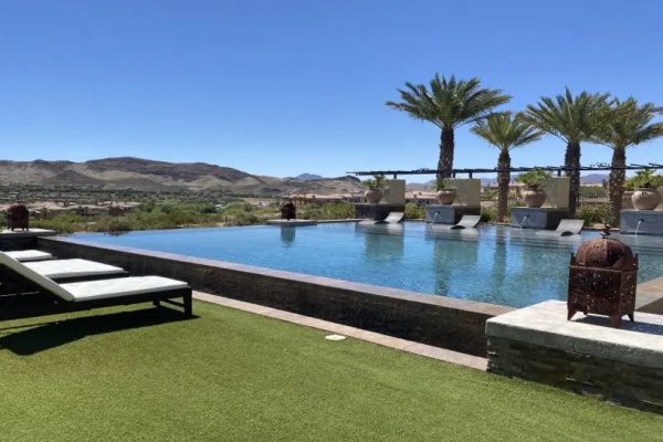 This beautiful pool provides a nice, quiet respite from the hustle and bustle of Las Vegas. Featuring amazing views of Lake Las Vegas, this pool with three fountains with lots of sun is located on the North Shore. It is equipped with a wet deck, a double day bed, two single day beds and a table with 6 chairs. This location offers a bunch of extras at no additional charge including a barbecue grill, WiFi, speakers, towels and even pool toys. It can accommodate up to 30 guests.