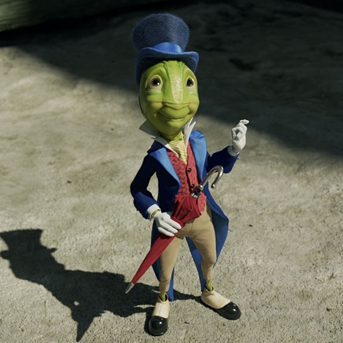 Staying true to Disney’s original, Pinocchio begins in Geppetto’s workshop. Jiminy Cricket is dressed like a hobo looking for a warm place to stay and he comments on the old cheerful man at his workbench. (Joseph Gordon-Levitt makes a fine Jiminy Cricket which at times sounds very much like Cliff Edwards) The movie hints that he is heartbroken after losing his wife and son many years ago. He creates a puppet in his son’s likeness. Hanks sings (talks?) about it in a new song, “When He Was Here with Me.”