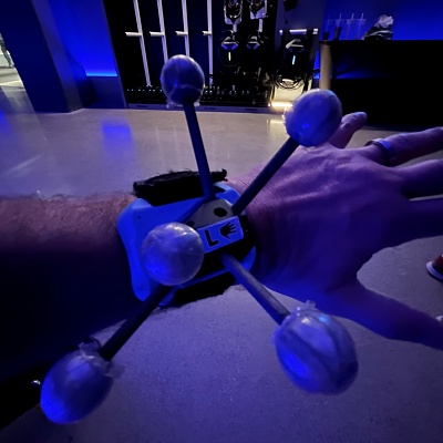 Soon, we met our host, Andy who told us that we needed to come up with a team name as well as character names. Consistently professional and friendly, Andy answered all of our questions that we had. He then handed out strange gizmos (that looked like ping pong balls on sticks) that are similar to the motion caption devices you have seen used in the movies. We attached these to our wrists and ankles. Next, Andy gave us form-fitting haptic suits before being led to our empty play space (or “sandbox” if you will) and a team of employees followed carrying special helmets that completely block out the real world.