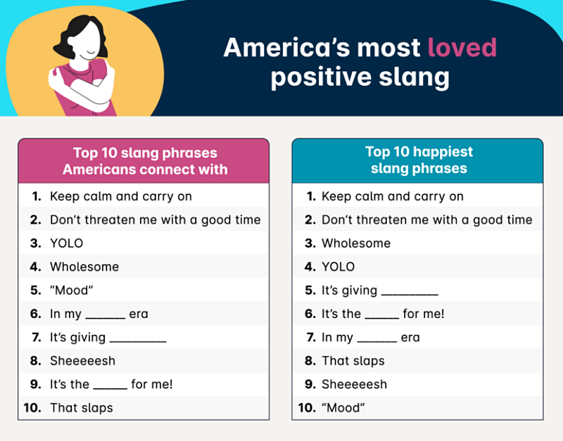 The top slang phrase Americans find happiest and feel most connected with is (drumroll please): “Keep calm and carry on”. This phrase, known as a British wartime slogan from 1939, surprisingly outranks newer colloquialisms like “wholesome” and “that slaps.”