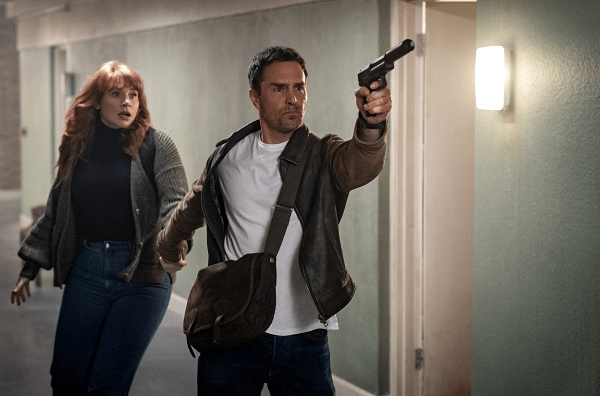 Catherine O’Hara is hilarious as Elly’s loving but overbearing mother. She is Elly’s biggest cheerleader who is thrilled with her daughter’s latest manuscript for a new espionage novel. But Ruth says that Elly’s new story needs some more work and offers to help her tighten it up. Begrudgingly, Elly agrees and begins travel back home with cat in tow. While on an Amtrak train, Elly’s real life begins to blur with her literary one. In a matter of minutes, she meets Aidan Wilde (Sam Rockwell), a mysterious stranger who calmly tells her that her fictional stories share ties with a real spy organization and that her life is in danger.