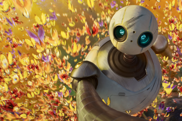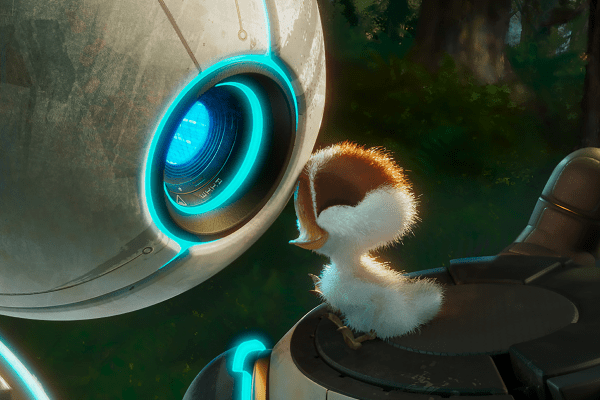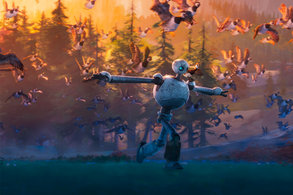 ROZZUM unit 7134, a helpful robot (not unlike Rosie from The Jetsons or Baymax from Big Hero 6) takes a beating when she awakes to find that she has mistakenly crash-landed on an island. Undeterred by her surroundings, she desperately questions the animals living there who it was that ordered her. Not understanding who she is or what she is, “Roz” (voiced by Lupita Nyong’o) is rejected by all of them. That is until she finds an orphaned gosling that she names Brightbill (Boone Storm and then later Kit Connor) and since baby birds tend to bond with the first things that they see once they are hatched, Roz becomes his mother. She sees the gosling as her new assignment.
